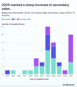 A standout finding from the 2025 report is a rise in alternative liquidity events. Traditional exit channels like IPOs remain constrained, but the global venture landscape is evolving: secondary sales and M&A are offering meaningful pathways for founders and investors to realize value. In 2025 alone, the Endeavor Catalyst portfolio saw 10 liquidity events, a substantial increase from just one in 2024, including acquisitions and secondary share transactions.